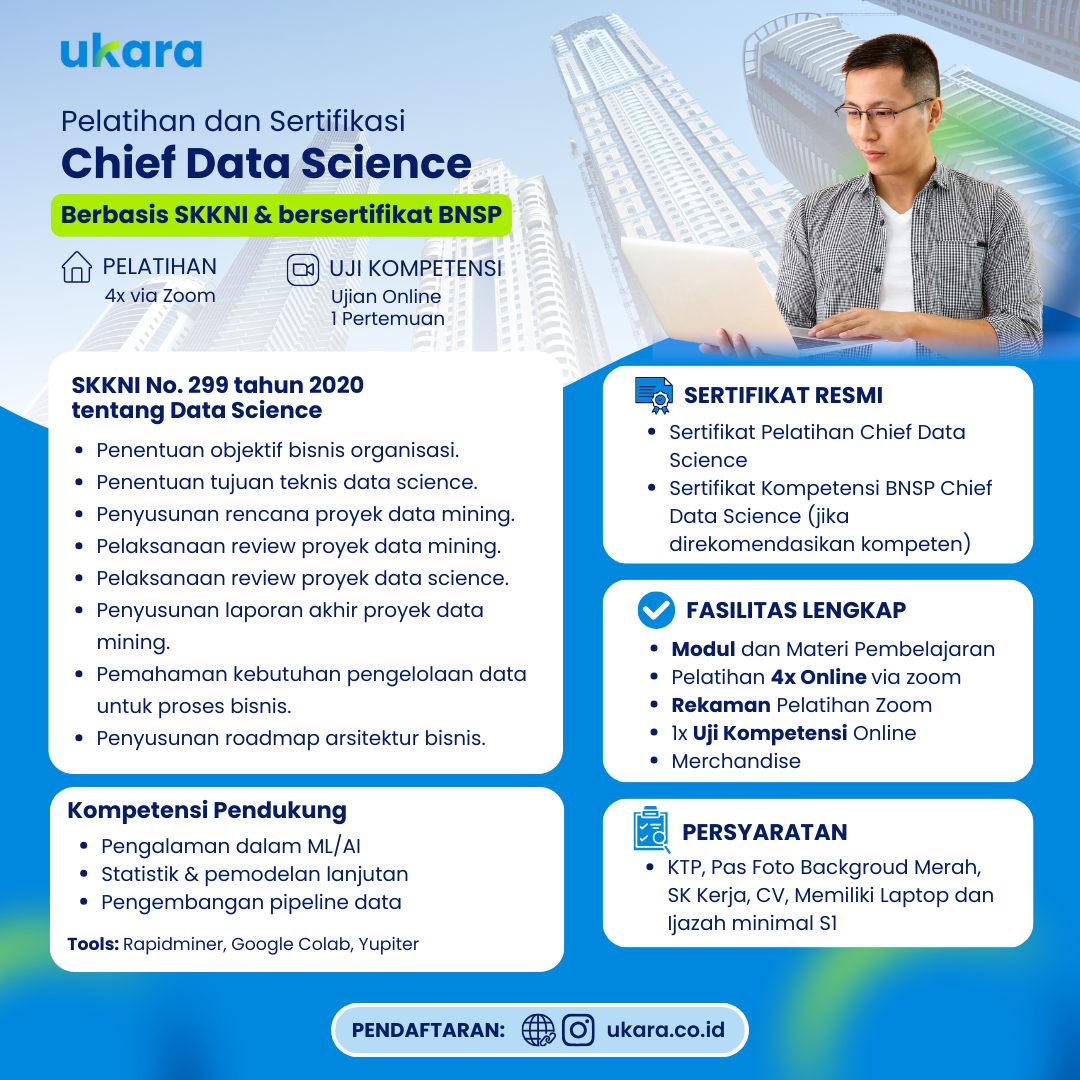 Pelatihan Chief Data Scientist dan Sertifikasi Profesi Chief Data Scientist BNSP adalah program yang dirancang untuk memberikan pemahaman mendalam tentang peran Chief Data Scientist sesuai dengan Standar Kompetensi Kerja Nasional Indonesia. Dalam pelatihan ini, Anda akan mempelajari berbagai aspek penting dari manajemen data tingkat tinggi, serta keterampilan yang dibutuhkan untuk memimpin tim data. Setelah berhasil menyelesaikan pelatihan dan ujian sertifikasi, Anda akan mendapatkan sertifikat BNSP yang akan memudahkan Anda dalam memperoleh peluang karir yang lebih baik atau meningkatkan posisi profesional Anda. Program ini dapat diikuti oleh individu maupun kelompok dari perusahaan atau organisasi.