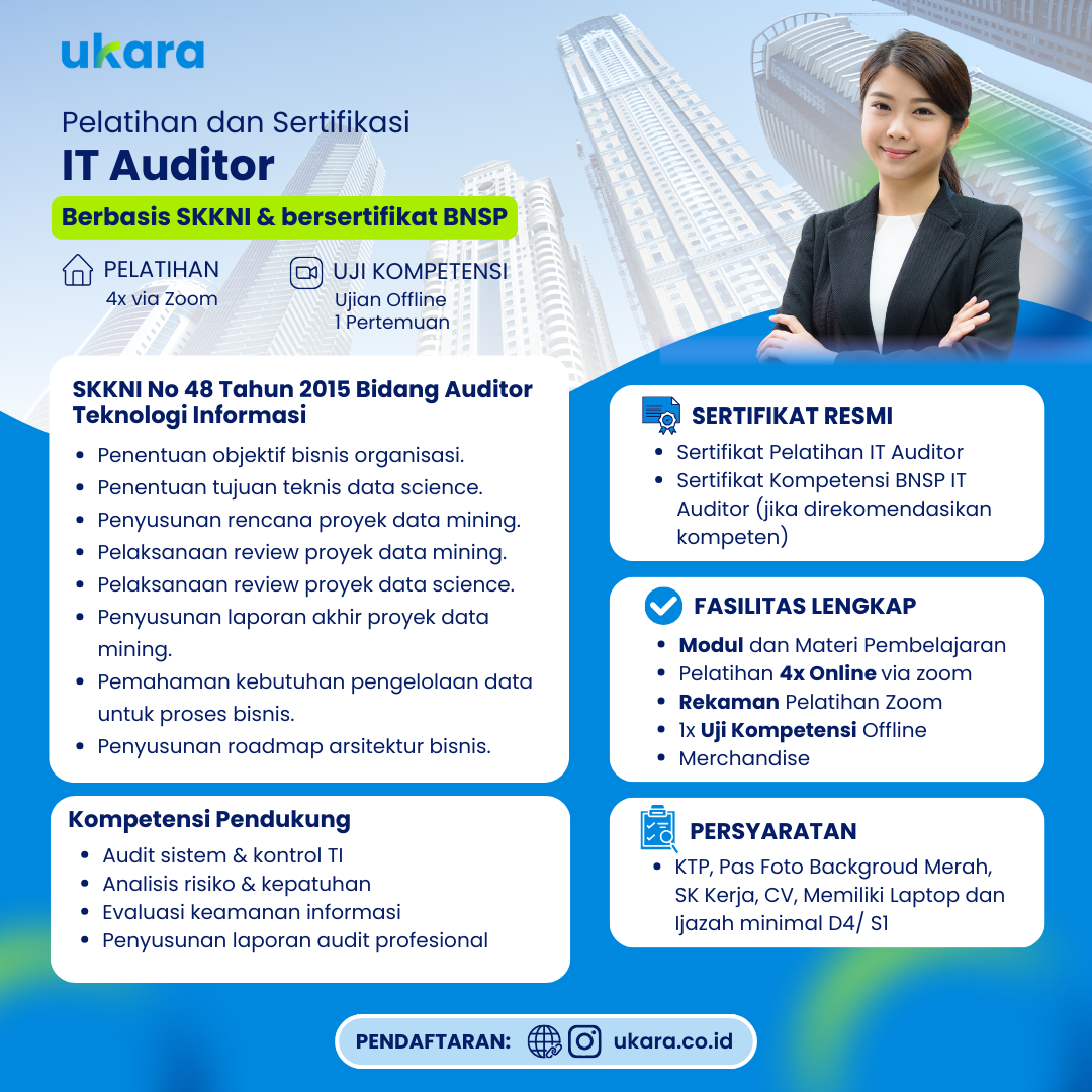 Pelatihan dan Sertifikasi IT Auditor adalah program yang dirancang untuk membekali peserta dengan kompetensi dalam melakukan audit sistem informasi dan teknologi. Peserta akan mempelajari perencanaan audit, evaluasi pengendalian internal, penilaian risiko TI, kepatuhan terhadap regulasi, hingga penyusunan laporan audit yang sesuai standar profesional dan kompetensi nasional.