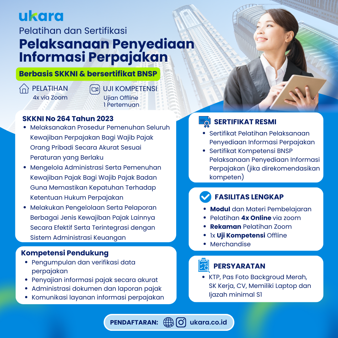 Pelatihan & Sertifikasi BNSP Pelaksanaan Penyediaan Informasi Perpajakan membekali peserta dengan kompetensi dalam melaksanakan penyediaan informasi perpajakan yang akurat dan dapat dipertanggungjawabkan. Program ini mengarahkan peserta untuk memahami kewajiban pajak, mengelola data perpajakan, serta memastikan kepatuhan terhadap regulasi yang berlaku.